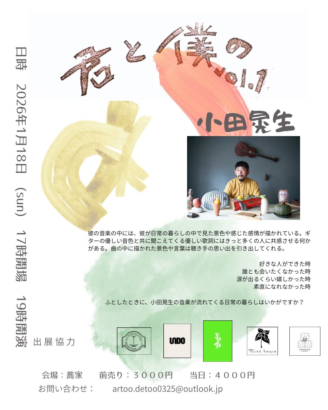 2026.01.18(日)長崎・めがね橋 蕎家 『君と僕の vol.1』 live 2025.12.30 2026.01.18(日)長崎・めがね橋 蕎家『君と僕の vol.1』 長崎で気持ちのこもったイベント企画をされているsmall things‘ eventさんからお声がけいいただき、お蕎麦屋さんで演奏いたします。長崎でのライヴ初めてです。どうぞよろしく。ぜひぜひお越しください。 《会場》長崎・めがね橋 蕎家 長崎県長崎市万屋町1-3《時間》開場 17:00 / 開演 19:00《料金》 前売 ¥3,000 / 当日 ¥4,000 / 学生 ¥2,000《出演》 小田晃生《出店》食べ物 UnDoお菓子 yolo.飲み物 / 本 ひとやすみ書店、茶茶茶展示 minthouse《 ご予約&お問い合わせ》メール:artoo.detto0325@outlook.jpInstagram:https://www.instagram.com/small_things_event