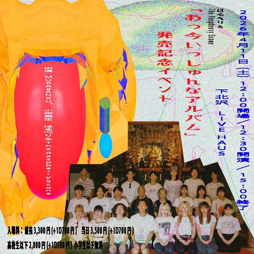 2026.04.11(土)東京・下北沢 LIVE HAUS『「あっ今いっしゅんなアルバム」 発売記念イベント』 live 2026.03.06 2026.04.11(土)東京・下北沢 LIVE HAUS『はるべり&The Raspberry Scone「あっ今いっしゅんなアルバム」発売記念イベント』 COINN齋藤紘良くんのご子息、17歳のはるべり君率いる “はるべり&The Raspberry Scone” のアルバムリリース記念イベントに出演!このあとはすぐ受験期間で活動休止とのことなので、今いっしゅんをお見逃しなく。共演にMURABANKU。!みんなでわちゃわちゃお祝いいたしましょ〜。 《会場》東京・下北沢 LIVE HAUS 世田谷区北沢2丁目14-2 JOW3ビル地下1階 https://livehaus.jp/ 《時間》開場 12:00 開場 / 開演 12:30 《料金》前売 ¥3,300(+1D ¥700)/ 当日 ¥3,500(+1D ¥700)高校生以下 ¥2,000(+1D ¥700)小学生以下無料 《出演》はるべり&The Raspberry Scone小田晃生MURABANKU。 《ご予約&お問い合わせ》予約フォーム:https://forms.gle/npNk89SnY614ghVD7 主催:saitocno labelデザイン:志村弥音写真:永戸耀士